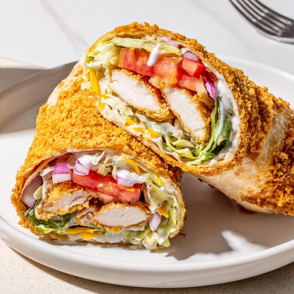 Buttermilk‑marinated chicken strips are dredged in a seasoned flour and panko mix, then fried until golden. Layer the crispy chicken into warm flour tortillas with shredded romaine, diced tomato, thinly sliced red onion and shredded cheddar, then finish with a drizzle of creamy ranch. Assemble, roll tightly and slice. Total time about 35 minutes; serves 4. Bake or air‑fry for a lighter option.