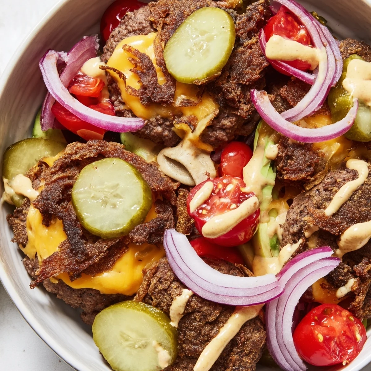 This deconstructed bowl captures all the irresistible elements of a classic smash burger without the bun. Thin, crispy beef patties are smashed to perfection on a hot griddle, creating those beloved crispy edges while staying juicy inside. The bowl layers mixed salad greens as the base, topped with fresh cherry tomatoes, thinly sliced red onion for bite, tangy dill pickles, and creamy avocado. A homemade smash sauce brings everything together with its creamy, tangy profile featuring mayonnaise, ketchup, mustard, and relish. Shredded cheddar and optional crispy fried onions add the perfect finishing touches. Ready in just 30 minutes, this satisfying meal delivers all the burger flavors you love in a lighter, low-carb format that's perfect for lunch or dinner.