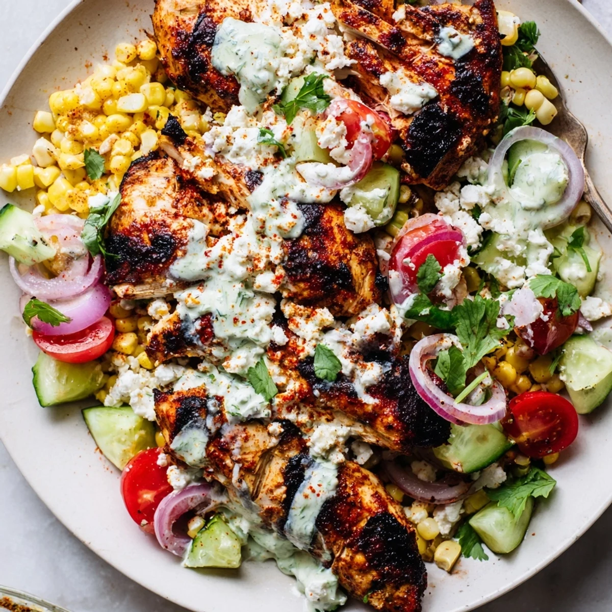 This refreshing dish combines smoky grilled chicken with sweet charred corn kernels and cool, crisp English cucumbers. The creamy dressing gets its tang from fresh lime juice and its subtle heat from chili powder and smoked paprika, while crumbled cotija cheese adds a salty finish. Perfect for warm weather dining, it comes together in just 35 minutes and can be served immediately or chilled for deeper flavor integration.